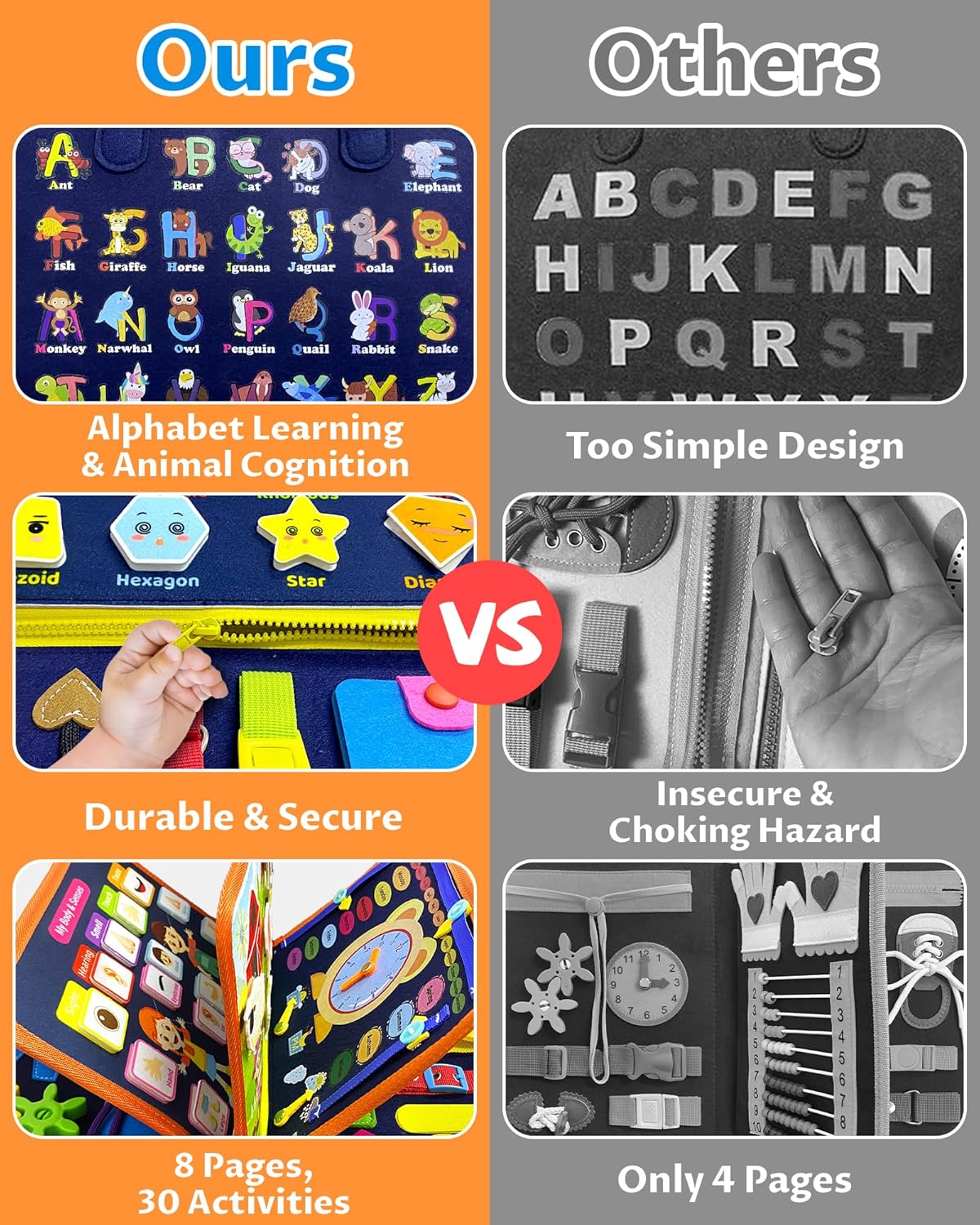 8 PAGES, ENDLESS FUN: We are so lucky to be discovered by you! Our 8 pages Montessori educational busy board helps your kids to develop fine motor skills. This toddler busy board is designed with different levels of difficulty, making it challenging, but not too excessive, to keep your child interested.