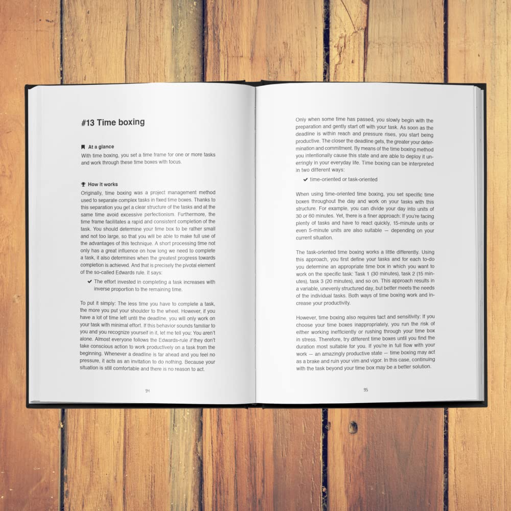To keep the whole thing from being dry theory, you’ll get examples and best practice instructions for uncomplicated application at every opportunity. Each time management technique is condensed into four pages and divided into efficient sections. In addition, you’ll receive exercises for each chapter so that you can directly apply what you have read. So, you can get started right away and make the most of this guide.