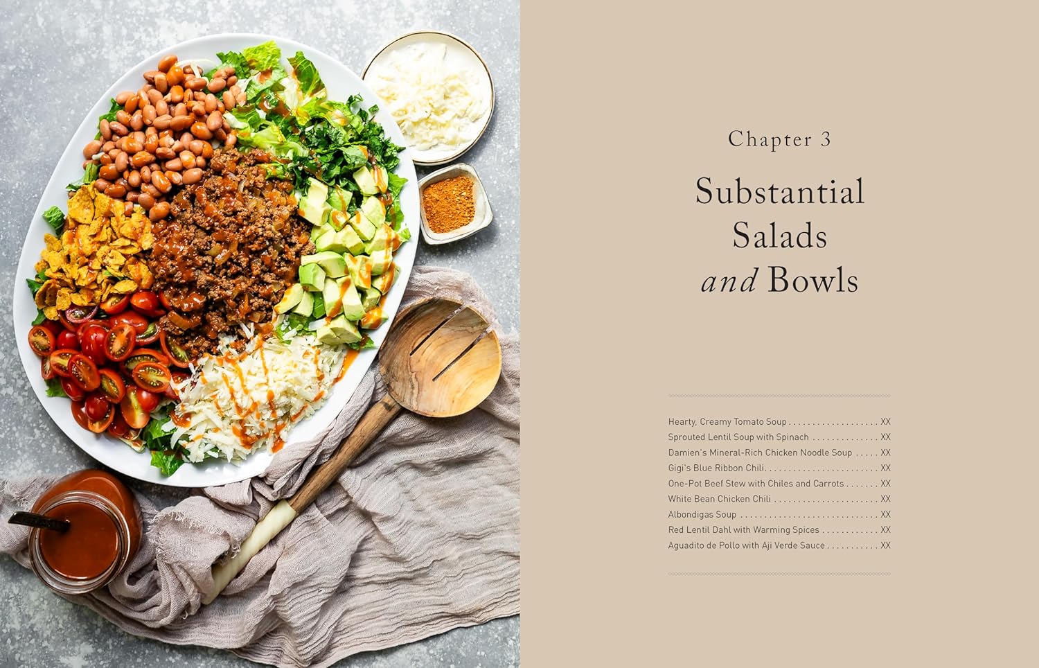 Nourishing Breakfasts: Cast-Iron Dutch Baby Pancake with Warm Berry Compote, French Toast Casserole, Grain Free Chocolate Chip Banana Bread, DIY Acai Bowl with Rich Maple Granola, Next Day Oatmeal Muffins, Perfect Pressure Cooked Eggs with Hashbrowns and Oven Bacon, Family-Style Breakfast Tacos, Crispy Potato and Egg Bake Substantial Salads and Bowls: Rainbow Salad, White Bean and Bacon Salad, Deli-Style Macaroni Salad, Sonoma-Style Chicken Salad Bowl, Taco Salad with Catalina Dressing, Mediterranean-Style Pasta Salad, Roasted Asparagus and Pecan Salad, Fresh Thai-Style Salad, Chopped Antipasto with Crispy Prosciutto, Sushi Roll in a Bowl, Hearty Sprouted Grains Bow Warming Soups and Stews: Hearty, Creamy Tomato Soup, Sprouted Lentil Soup with Spinach, Damien’s Mineral-Rich Chicken Noodle Soup, Gigi’s Blue Ribbon Chili, One-Pot Beef Stew with Chiles and Carrots, White Bean Chicken Chili, Albondigas Soup, Red Lentil Dahl with Warming Spices Lighter Plates: Falafel Night with Quinoa Tabouli and Tzatziki, Top Notch Ramen, Spaghetti Squash Bake with Roasted Tomato Marinara, Grain Free Crispy Fish with Oven Fries and Coleslaw, Seared Scallops with Pesto Pasta, Pineapple Chicken Curry, Thai Lettuce Cups with Peanut Sauce Heartier Dishes: Chicken Pot Pie, Turkey Burger Bowls with Sweet Potato Cubies and Pickled Red Onion, The Wholesome Whole Chicken, Bone Broth (and veggie scrap broth), Enchiladas Verdes with Refried Beans and Taqueria-Style Roasted Carrots, Chimichurri Beef Pasta, Mississippi Pot Roast, Pasta Pot, House Bolognese, Cottage Pie, Bacon Wrapped Meatloaf with Crispy Smashed Potatoes and Grilled Artichoke Sweets and Sips: Grain Free Carrot Cake with Cream Cheese Frosting, Paleo Chocolate Chip Cookies, Candy Bar Dates, Dairy Free Caramel Corn, Frost It, Top It, Dip It (Coconut Whipped Cream, Pressure-Cooked Caramel, and Dye-Free Berry Buttercream), Chocolate Pudding with Raw Honey Whipped Cream, Maple Cinnamon Marshmallows, My Mega Matcha, Gelatin Gummies, Quick Chia Jam, Honey Lemonade, Healthier Hot Chocolate
