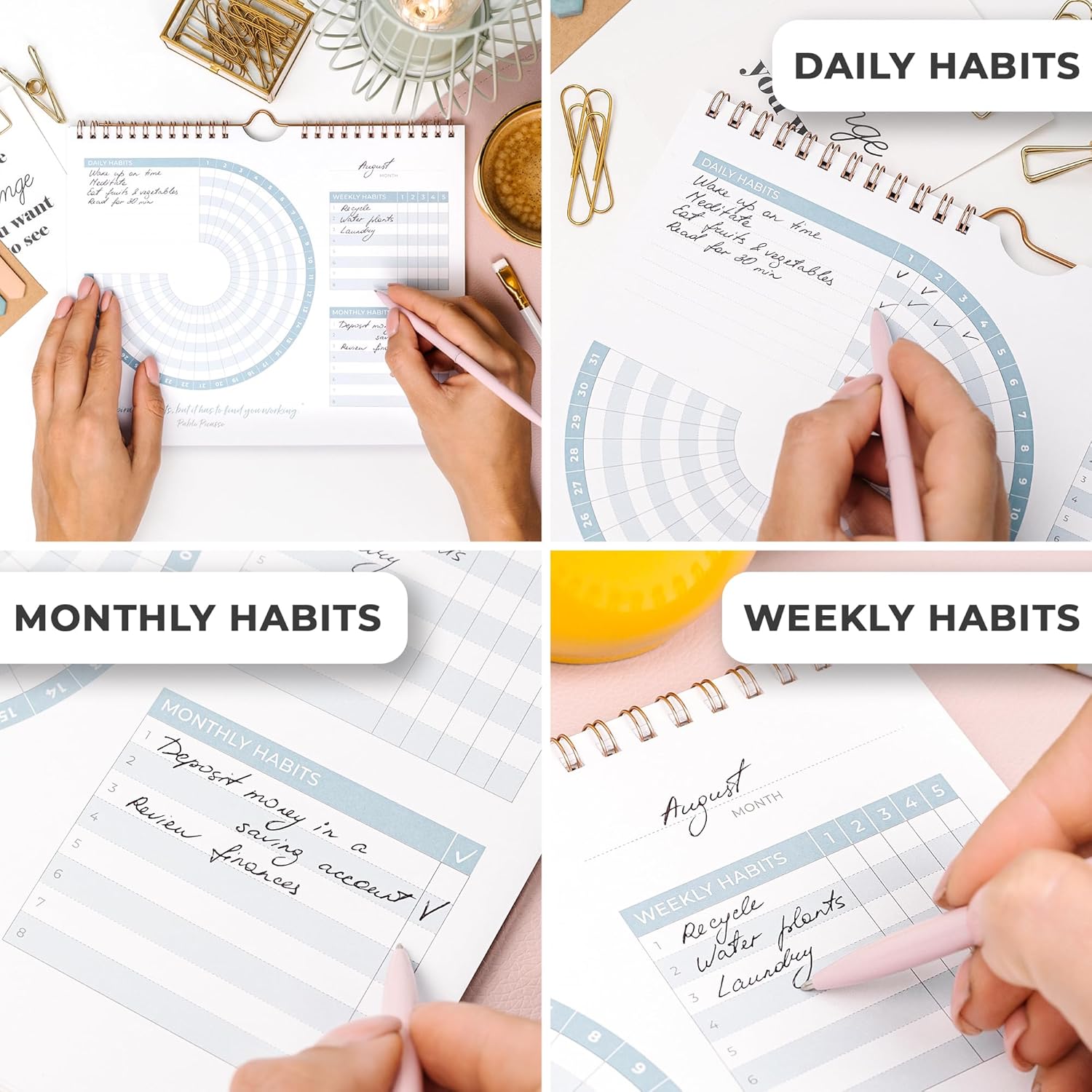 Incorporate habit tracking with detailed weekly and monthly planning and goal-setting layouts