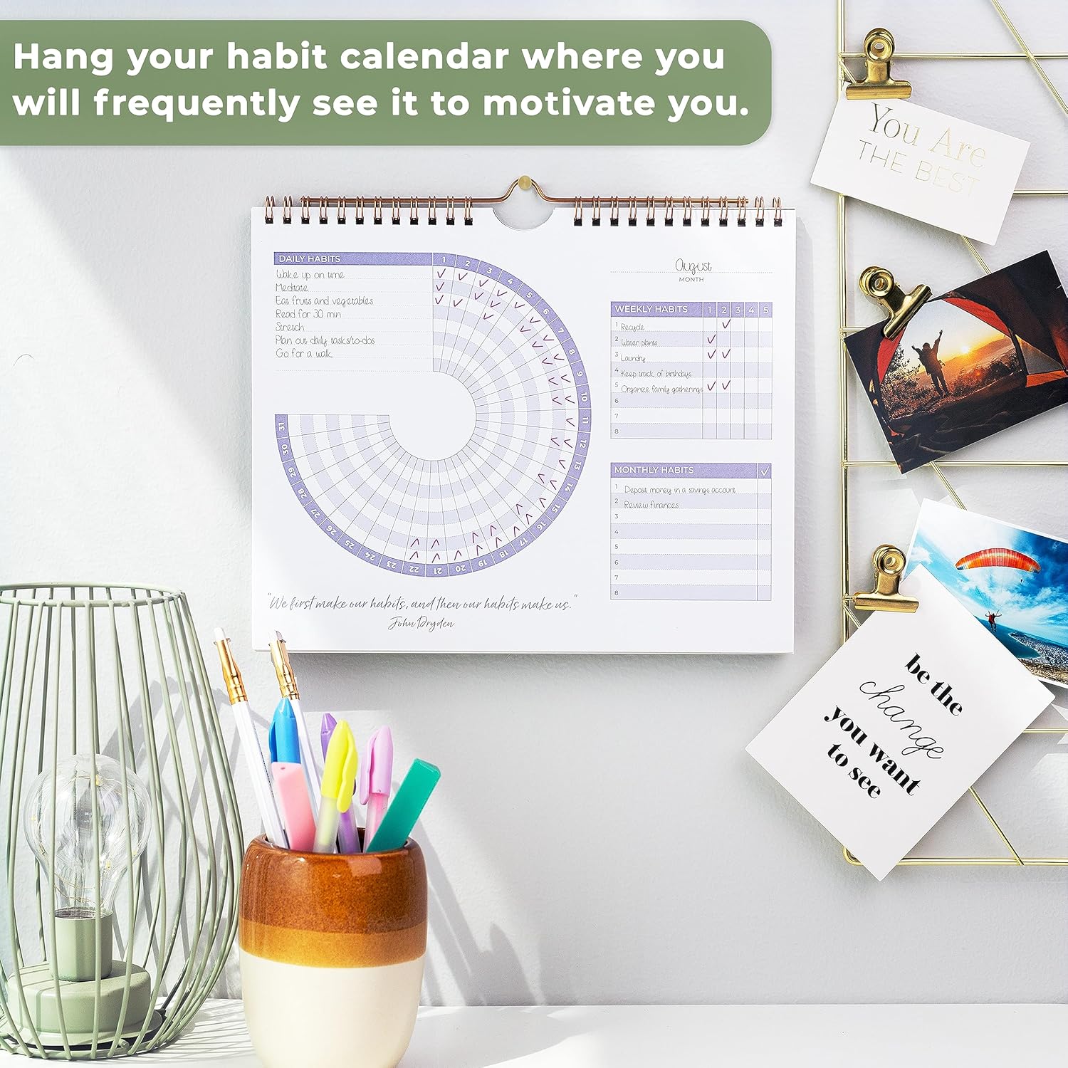 This habit tracker calendar has 24 monthly pages to keep a record of how much you’ve achieved. The 12 color schemes for each month of the year make this a beautiful addition to any room you choose to hang it in.