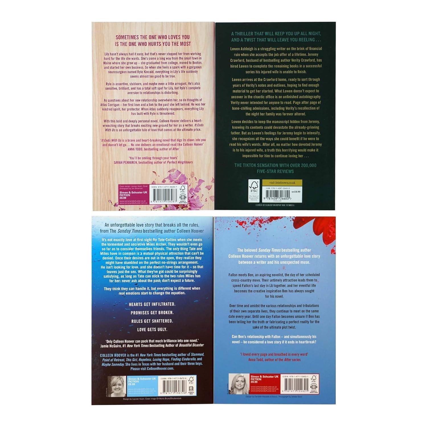 It Ends with Us: A Novel – 9781501110368 In this “brave and heartbreaking novel that digs its claws into you and doesn’t let go, long after you’ve finished it” (Anna Todd, New York Times bestselling author) from the #1 New York Times bestselling author of All Your Perfects, a workaholic with a too-good-to-be-true romance can’t stop thinking about her first love. Verity – 9781538724736 Whose truth is the lie? Stay up all night reading the sensational psychological thriller that has readers obsessed, from the #1 New York Times bestselling author of It Ends With Us. Ugly Love: A Novel - 9781476753188 When Tate Collins meets airline pilot Miles Archer, she doesn’t think it’s love at first sight. They wouldn’t even go so far as to consider themselves friends. The only thing Tate and Miles have in common is an undeniable mutual attraction. Once their desires are out in the open, they realize they have the perfect set-up. He doesn’t want love, she doesn’t have time for love, so that just leaves the sex. Their arrangement could be surprisingly seamless, as long as Tate can stick to the only two rules Miles has for her. November 9: A Novel - 9781501110344 Fallon meets Ben, an aspiring novelist, the day before her scheduled cross-country move. Their untimely attraction leads them to spend Fallon’s last day in Los Angeles together, and her eventful life becomes the creative inspiration Ben has always sought for his novel. Over time and amidst the various relationships and tribulations of their own separate lives, they continue to meet on the same date every year. Until one day Fallon becomes unsure if Ben has been telling her the truth or fabricating a perfect reality for the sake of the ultimate plot twist. *Including Exclusive Bookmark*