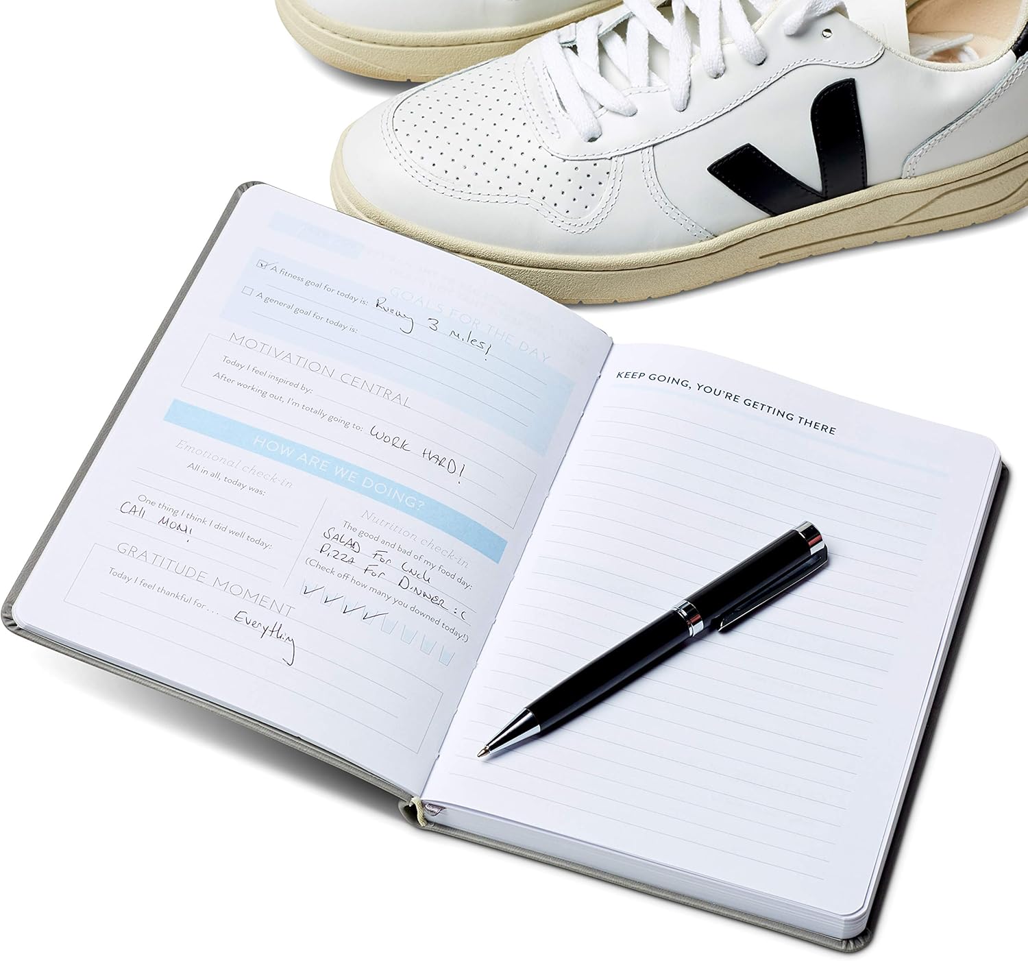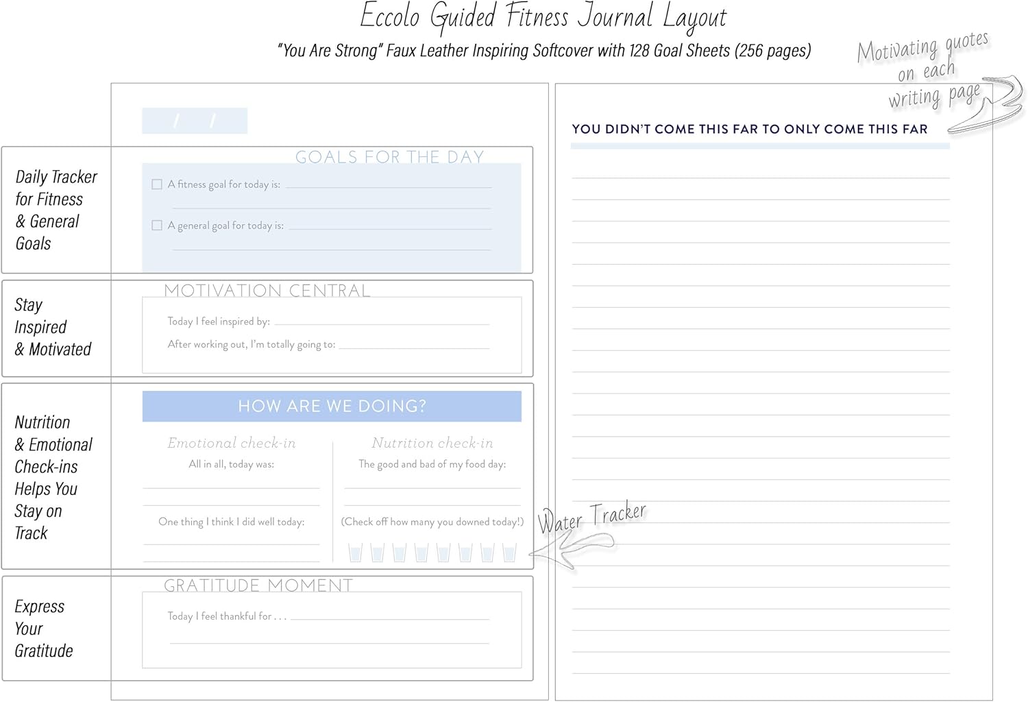 The Eccolo fitness journal notebook is made out of 128 goal sheets. Each page allows you to record your fitness and general goal for the day, what motivates you, and an emotional check-in to document how you feel and what you did well that day. A meal planner and nutrition check-in to document good and bad food choices along with how many glasses of water drank and a gratitude moment you’re thankful for that day