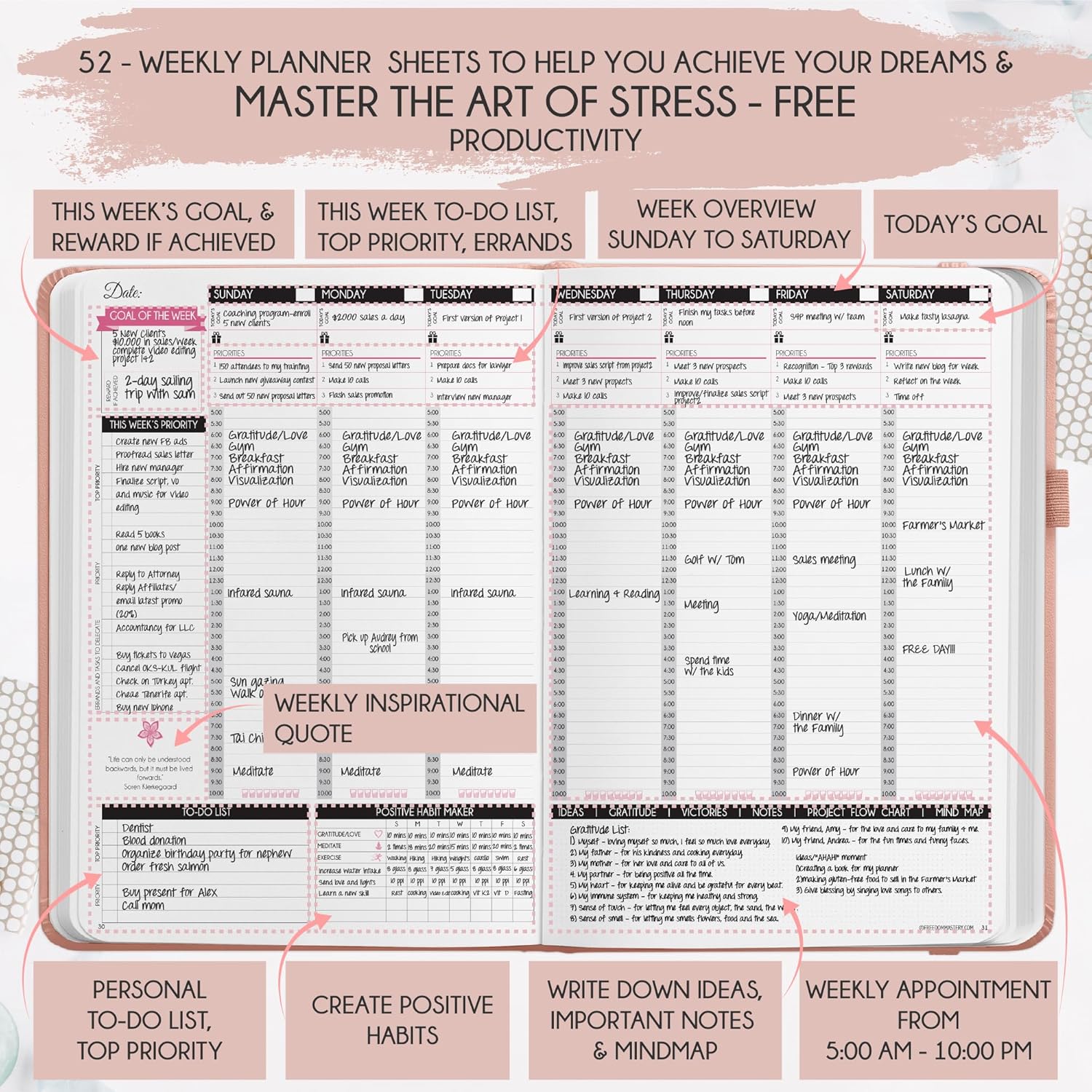 WEEKLY PLANNER 2025 – Increase your productivity and happiness. This is a deluxe life goal planner showing you how to become the best possible version of yourself on a mental, physical & interpersonal level using the law of attraction vibration guide. This 2025 planner weekly and monthly is also a daily planner, monthly planner, weekly planner, productivity planner, goal planner, business planner, to do list planner, planner notebook & gratitude journal all-in-one.
