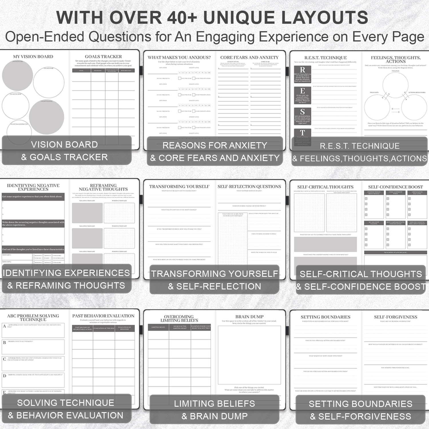 PREMIUM QUALITY & USER-FRIENDLY DESIGN: This A5 size self-help journal has a sturdy hardcover with an attractive hot silver pattern for both aesthetics and durability. Its thick 120gsm white paper is perfect for writing without bleeding or smudging. Complete with 3 colorful ribbon bookmarks, a sturdy pen loop, an elastic band, and a back pocket. With no overt mention of “worry” or “anxiety” on the cover, your personal journey remains private, allowing you to take it with you wherever you go.