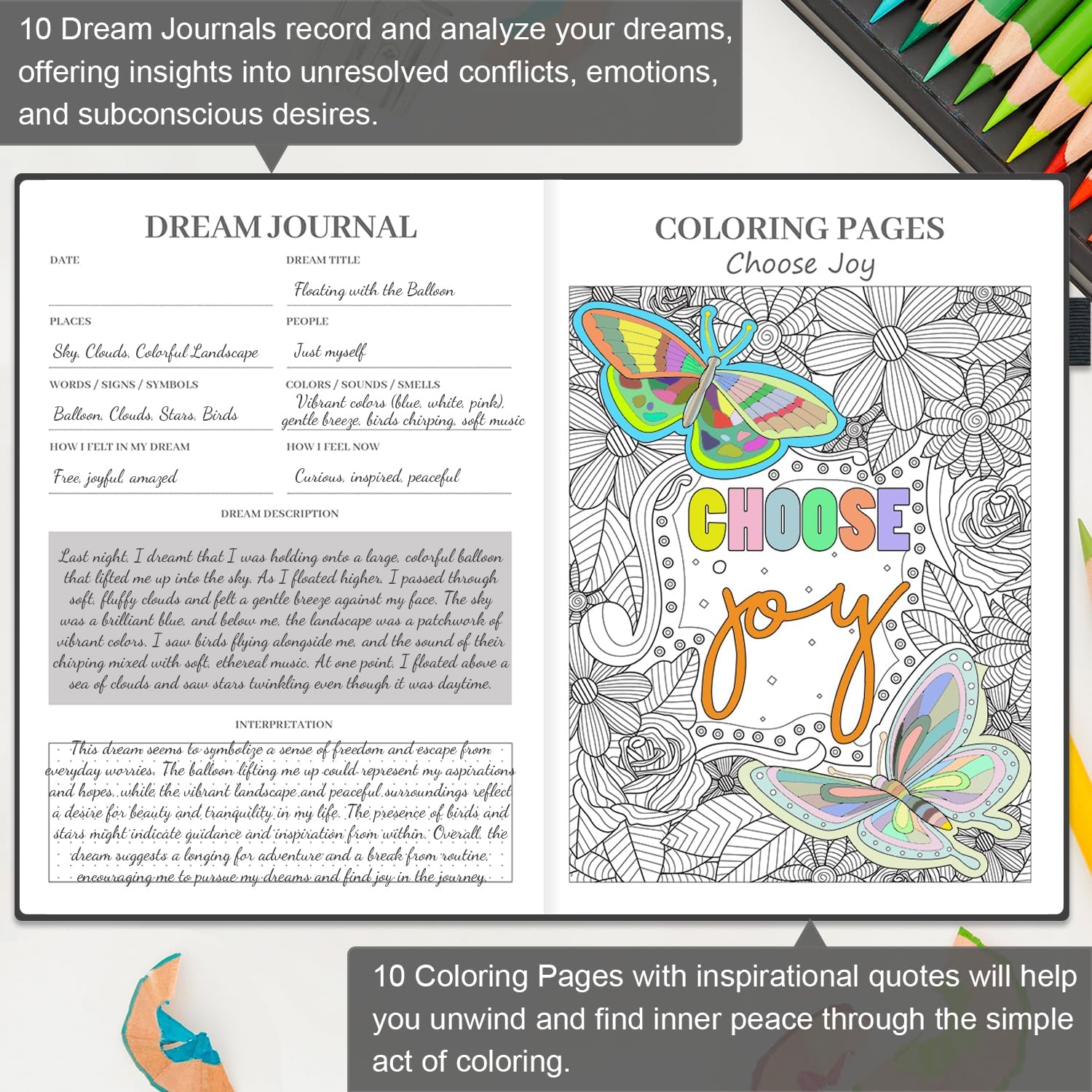CREATIVE & THERAPEUTIC TOOLS: Features 10 dream journals for analyzing subconscious thoughts and 10 coloring pages with inspirational quotes, offering therapeutic and relaxing activities to enhance mental well-being.