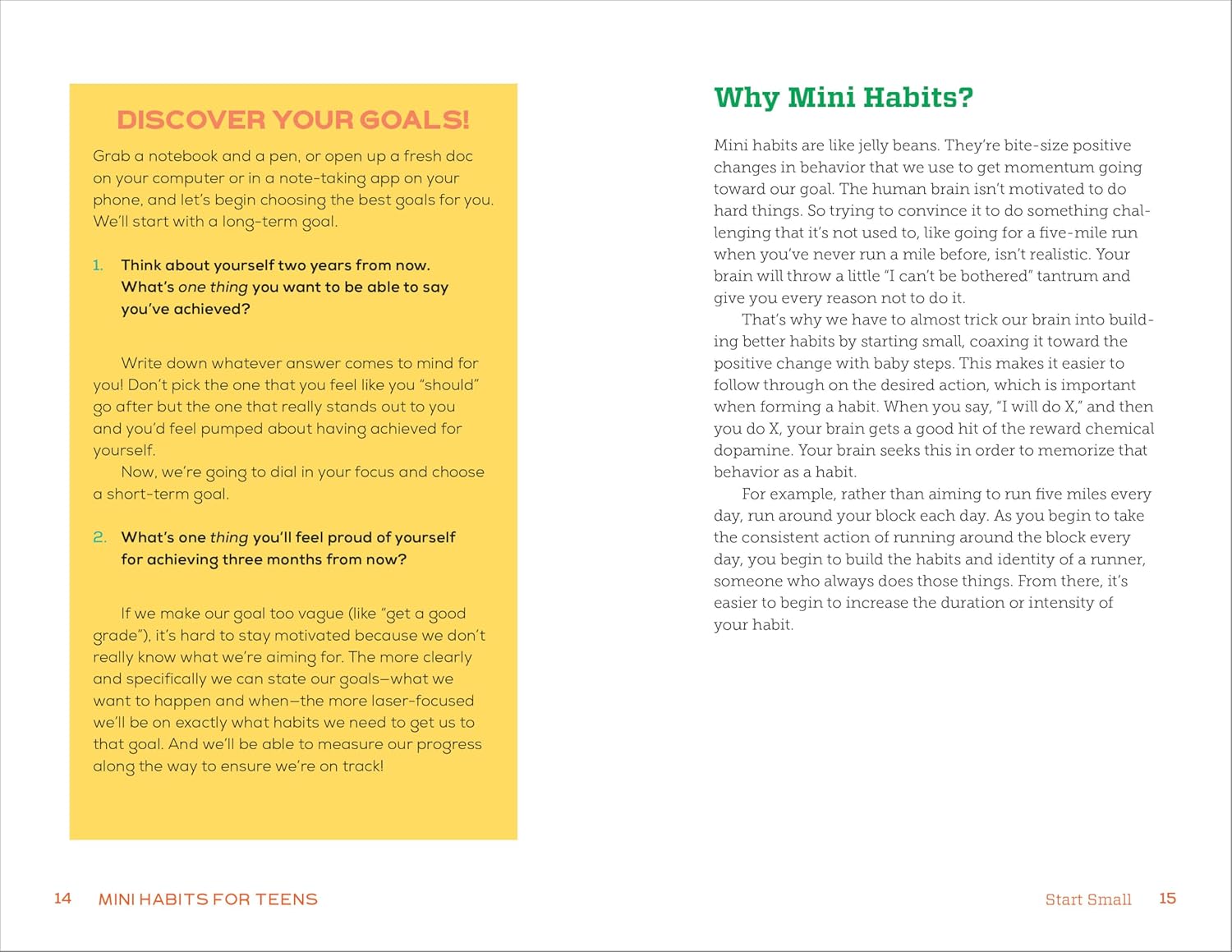 There’s no action too small when it comes to creating better habits. For teens looking to boost their grades, make a new friend, or save money for something special, forming healthy habits is the key to success both right now and in the future. Mini Habits for Teens shows them how to build good habits that stick, with easy advice for practicing little, everyday changes that help them work toward their goals one step at a time.