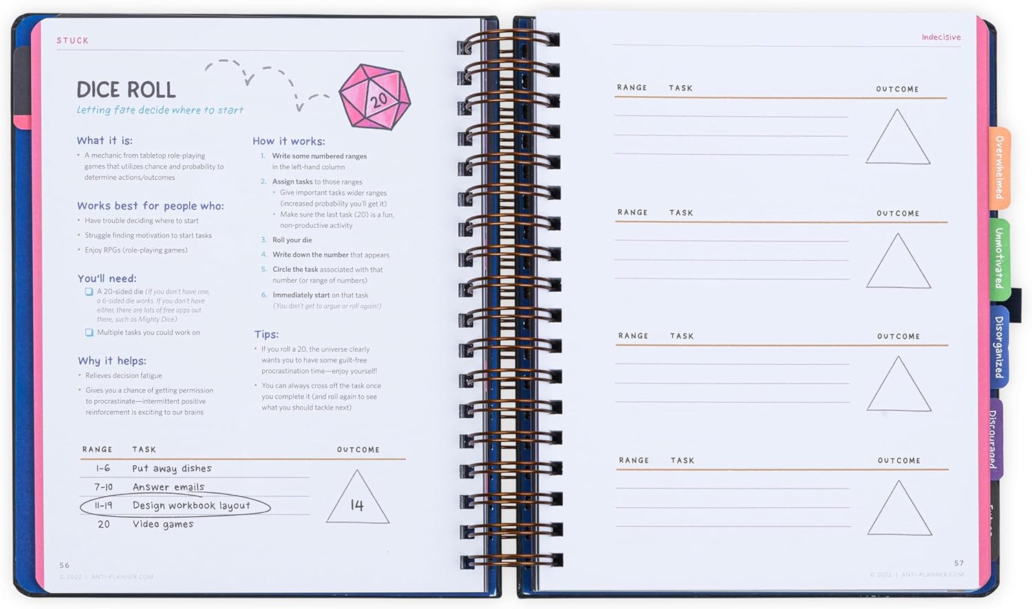 Break Free from Planning: The Anti-Planner is a vibrant activity book with over 165 strategies designed for those who find traditional planners boring or hard to use.Explore Creative Task Completion: Engage with over 100 activities that make your daily to-dos a fun experience and help you with emotional and productivity roadblocks to tackle your to-do list.More Than Just a Planner: This productivity activity book is undated and doesn’t have calendars, allowing for a flexible schedule and task management.Life-Changing Impact: Described as a “life-changing masterpiece” and “the Bible for procrastinators,” it’s a secret weapon for tackling those responsibilities without the stress. Created by an Adult with ADHD for people with ADHD, but it works for anyone struggling to get stuff done.Vibrant and Inspirational Design: Features over 300 full-color pages to inspire creativity and enhance the joy of completing tasks, improving mental health visually.