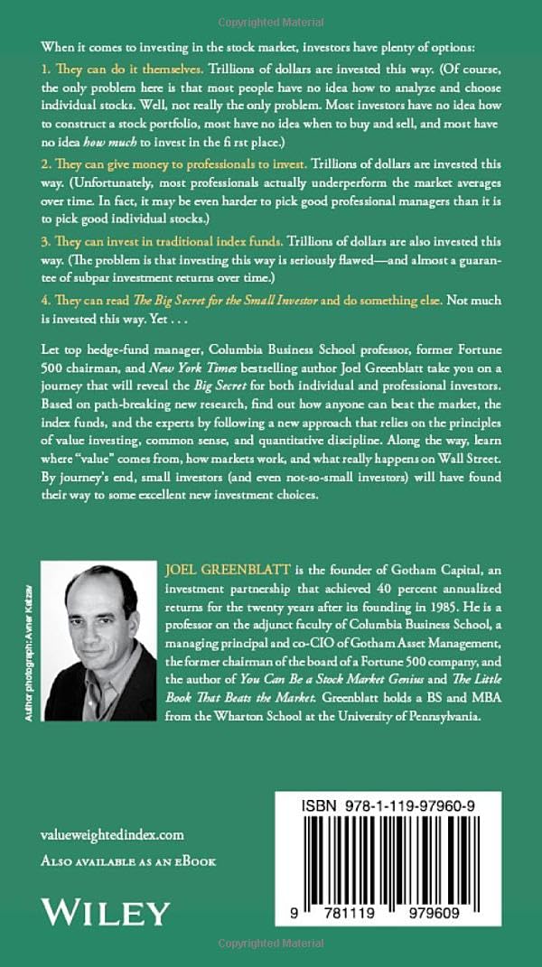 Let top hedge-fund manager, Columbia Business School professor, former Fortune 500 chairman, and New York Times bestselling author Joel Greenblatt take you on a journey that will reveal the Big Secret for both individual and professional investors. Based on path-breaking new research, find out how anyone can beat the market, the index funds, and the experts by following a new approach that relies on the principles of value investing, common sense, and quantitative discipline. Along the way, learn where “value” comes from, how markets work, and what really happens on Wall Street. By journey’s end, small investors (and even not-so-small investors) will have found their way to some excellent new investment choices.
