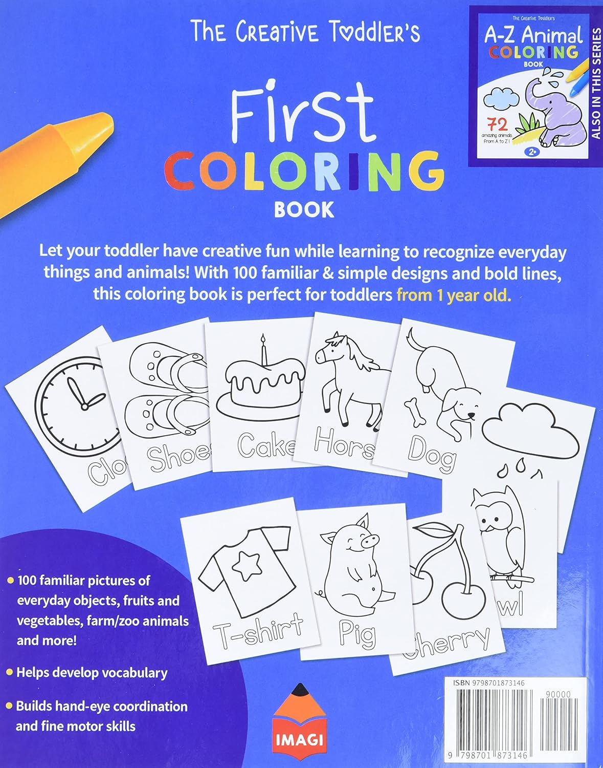 A Fun and Educational Toddler Coloring Book, perfect for toddlers ages 1-3!Let your toddler have creative fun while learning to recognize everyday things and animals! With 100 simple & familiar pictures (of everyday objects, fruits and vegetables, forest animals, farm animals, zoo animals and more!) this coloring book is perfect for toddlers from 1 year old!