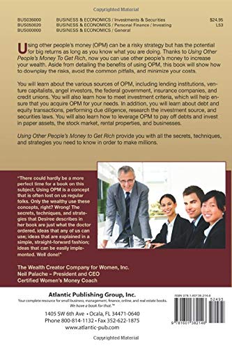 Using other people s money is becoming an increasingly common practice. In fact, you have probably used other people s money at some point without even realizing it. Even Donald Trump used other people s money to finance his investments. Now, with this book, you too can knowingly use other people s money to increase your wealth. Using other people s money, or OPM, can be a risky strategy, but Using Other s People Money to Get Rich will show you how to downplay the risks, avoid the common pitfalls, and minimize your costs. You will learn about various sources of OPM, including lending institutions, venture capitalists, angel investors, the federal government, investment banks, savings and loan associations, insurance companies, and credit unions. You will also learn how to meet the source s investment criteria, which will help ensure that you acquire OPM for your needs. In addition, you will become knowledgeable about the benefits of using OPM, debt and equity transactions, performing due diligence and research, the short- and long-term costs, and securities laws. You will also learn how to use OPM to pay off debts and invest in paper assets, the stock market, rental properties, and part-time, home-based, or Web-based businesses. We spent hours interviewing investors to learn how they used OPM to make money, and here, we provide you with all the secrets, techniques, and strategies you need to know in order to make millions.