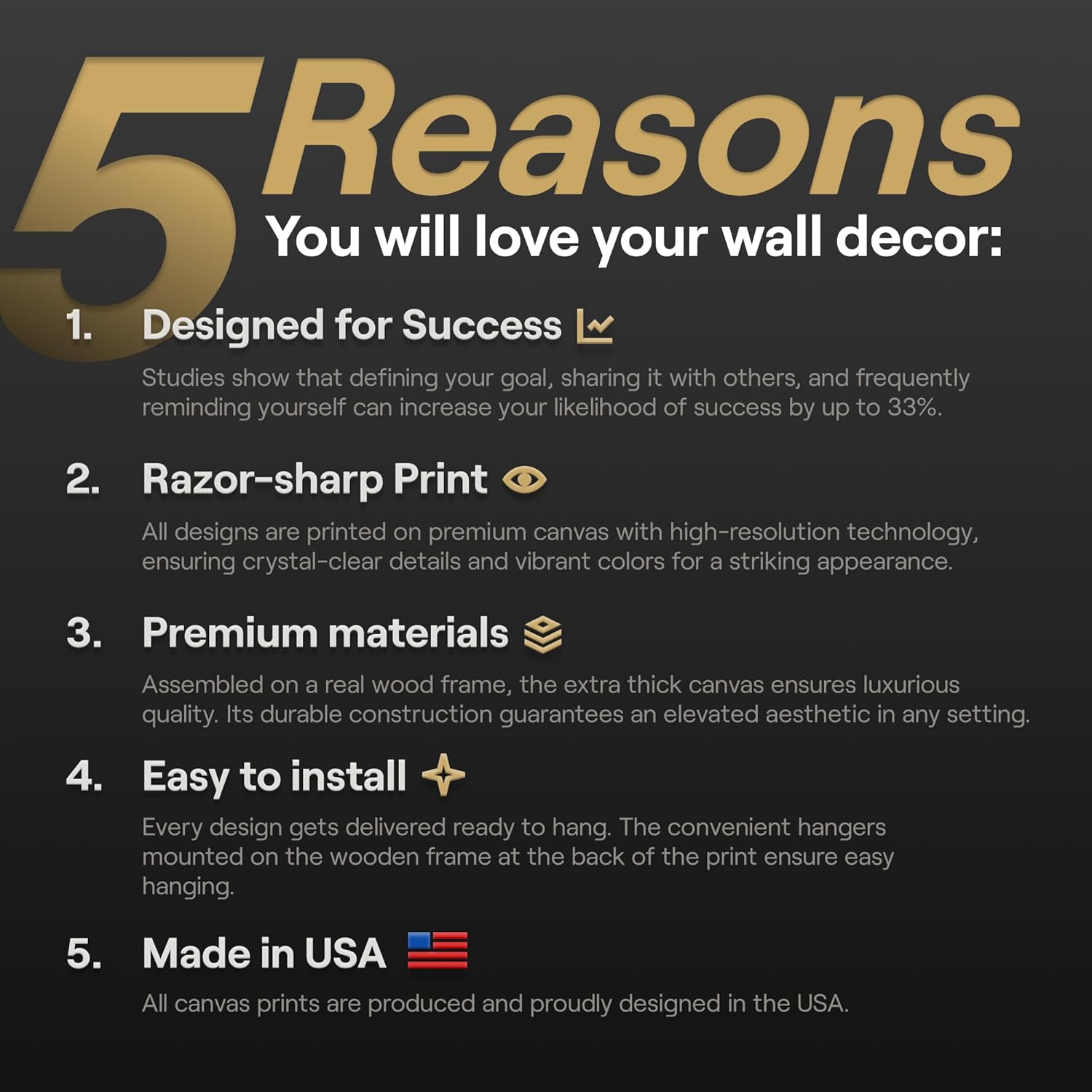 Made in the USA – Our exclusive canvas arts are designed and made in the USA. Skilled artisans handcraft each wooden frame to be warp resistant. With hanging hardware pre-installed, your inspirational artwork is ready to hang out the box.