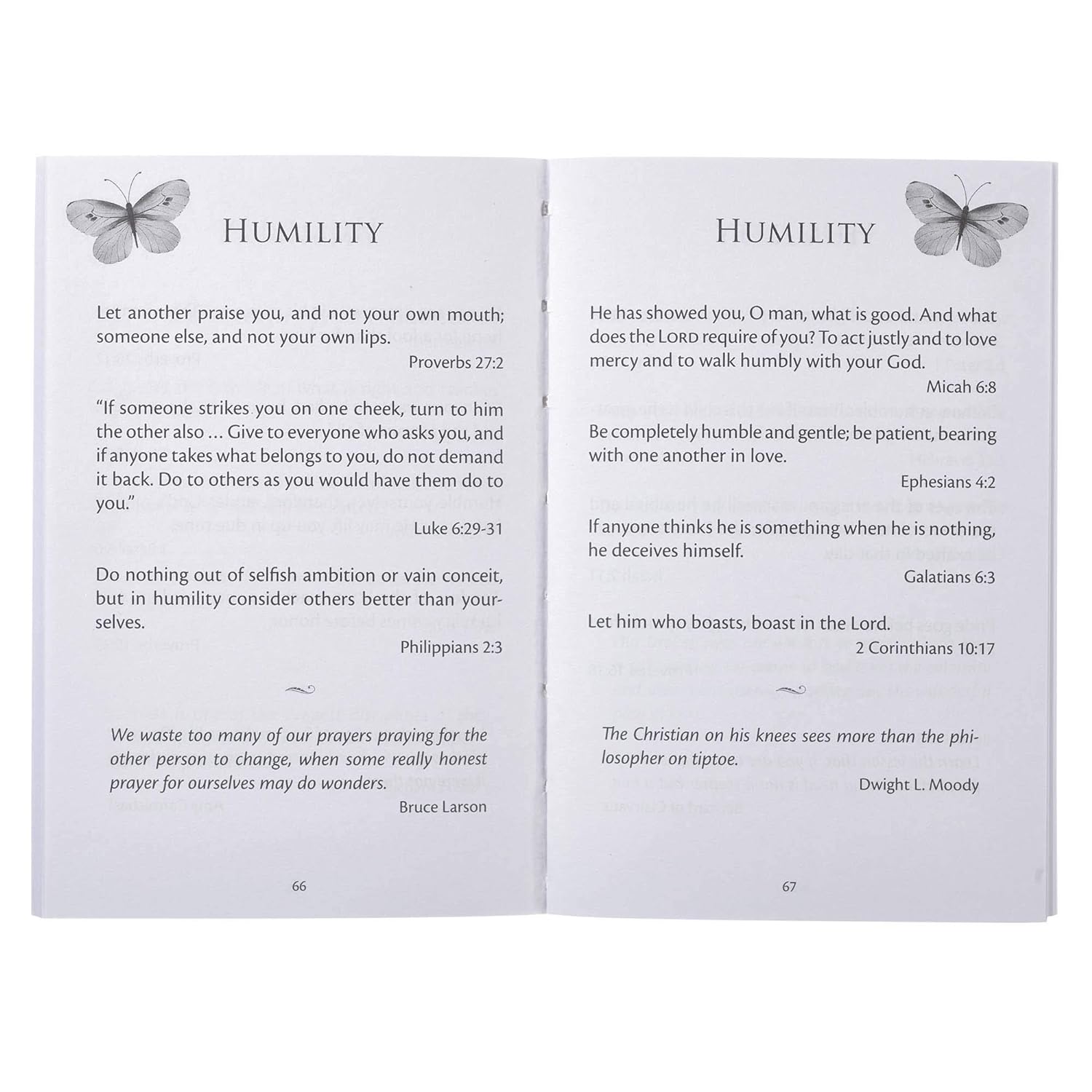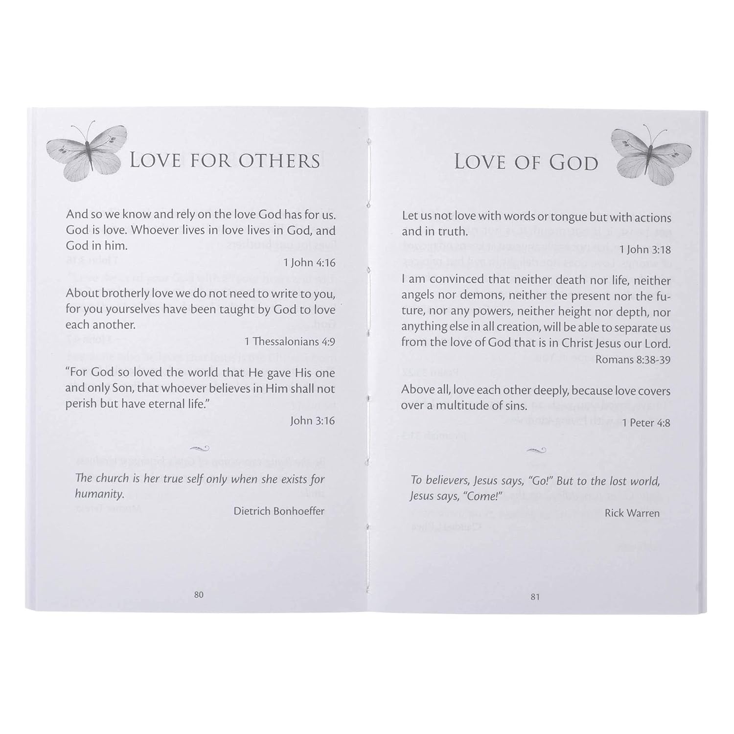 The very first page is a presentation page you can complete when giving this little gift book as a gift, or you can adapt it to mark this book as your own. Next, a table of contents lists 40 themes that make it easy to find biblical promises and quotes from spiritual leaders to apply to your situation. Some topics include anger, death, enemies, failure, grace, hate, jealousy, loneliness, obedience, peace, salvation, temptation, wisdom, and many more. You are sure to find a promise that you can apply to your life.